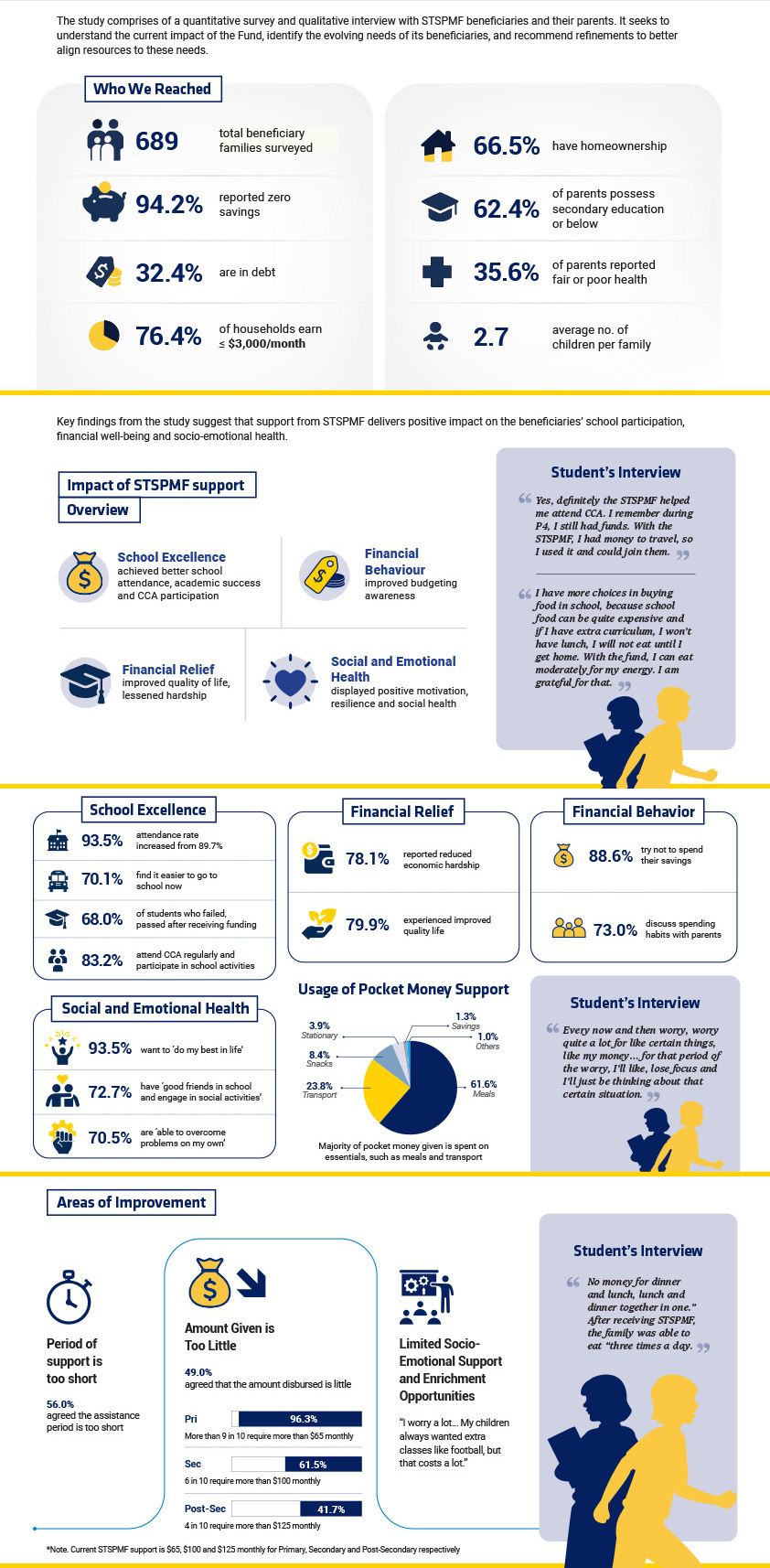 We conducted a study with Singapore University of Social Sciences (SUSS) in 2025 to evaluate the impact of our support on our beneficiaries and their families, as well as to gather insights so as to review our scheme to better meet their needs. The key findings are summarised below.