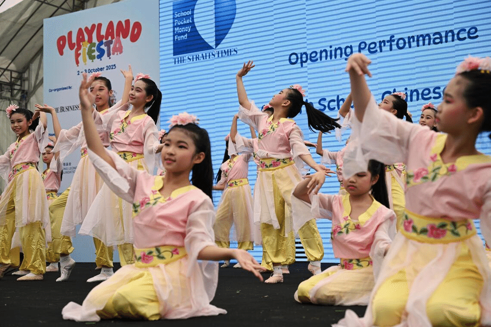 Students from Rosyth School Chinese Dance perform at the opening of The Straits Times School Pocket Money Fund annual appreciation lunch at Fort Canning Park, on Oct 3.